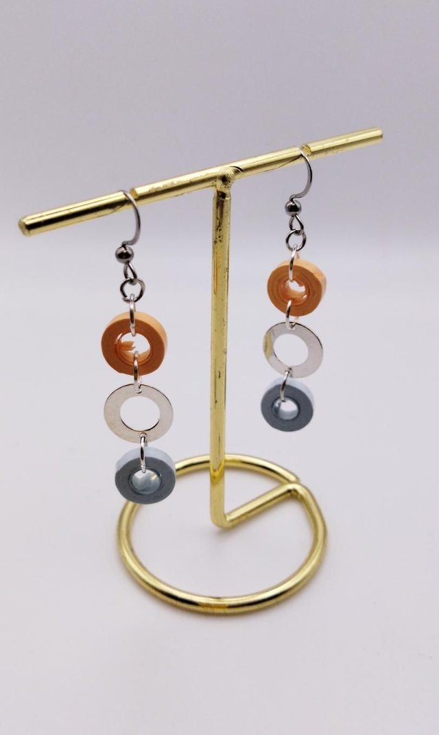 Ces boucles d'oreilles sont discrètes par leur couleur ,saumon et bleu clair, et fantaisies par leur forme.