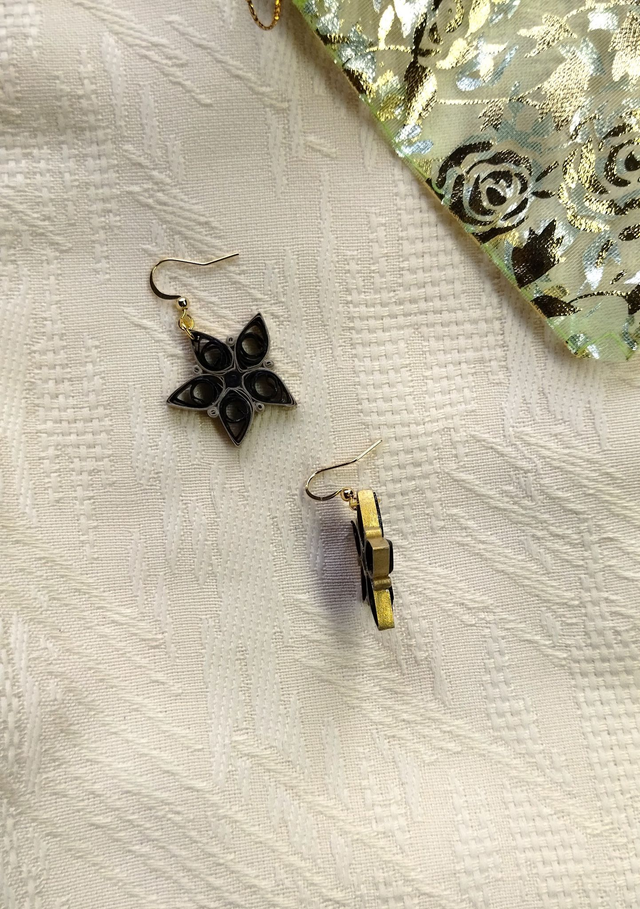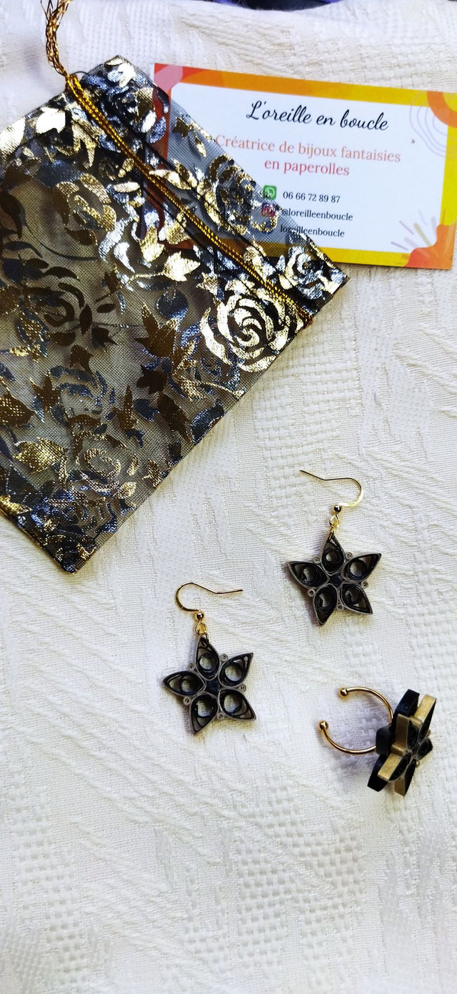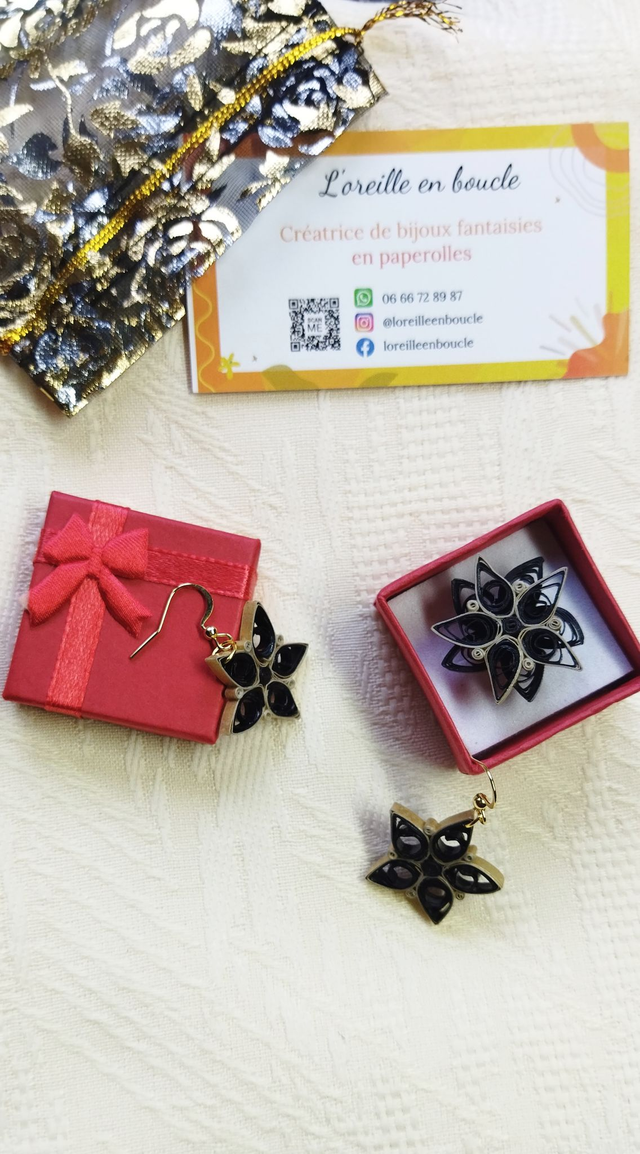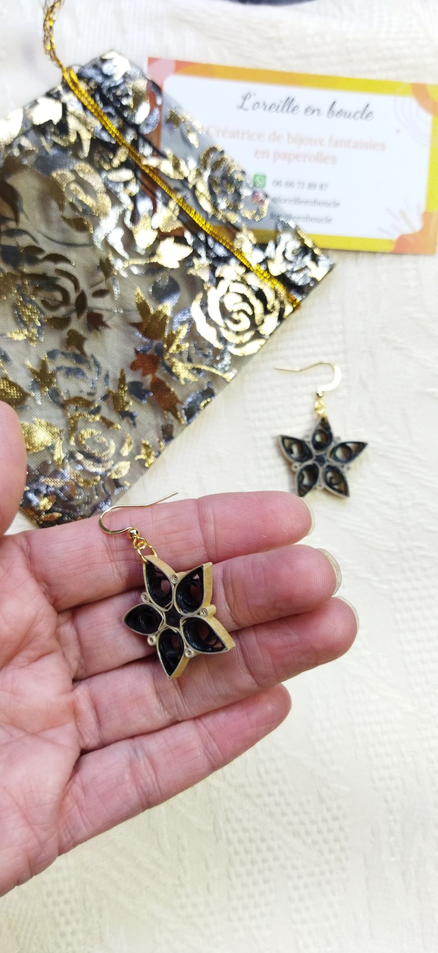 Leur design unique associe un cœur noir profond et intense à un extérieur doré scintillant, créant un contraste captivant qui attirera tous les regards. Les fines paperolles méticuleusement pliées et assemblées confèrent à ces boucles d'oreilles une texture et une dimension uniques, tandis que leurs couleurs festives et élégantes en font le complément idéal pour toutes vos tenues de fin d'année.